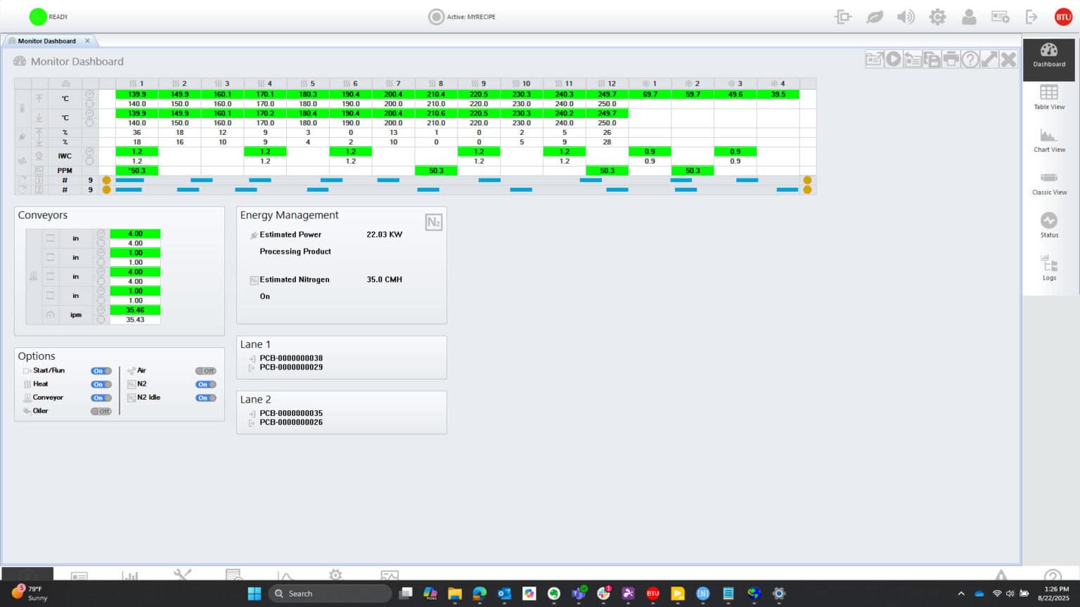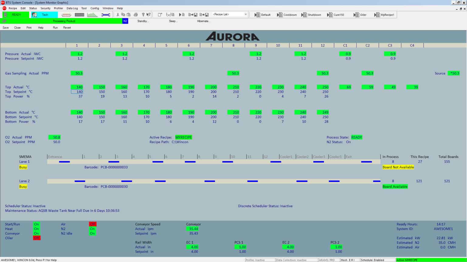 Engineered specifically for thermal processes, Wincon enables unmatched control, accuracy, and uptime. Since 1996, Wincon™ has been the trusted thermal control system behind BTU’s reflow ovens and custom belt furnaces. It combines an intuitive graphical user interface with powerful diagnostic and analytical tools to streamline setup, operation, and optimization.