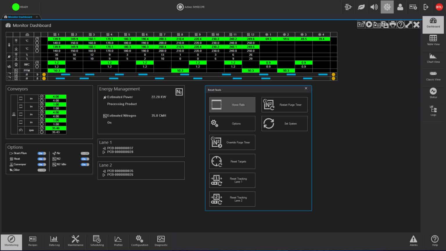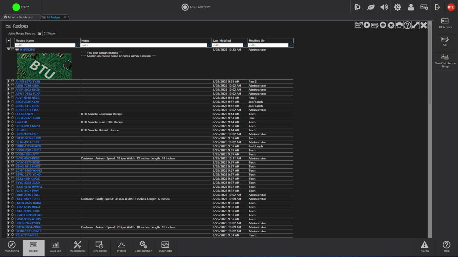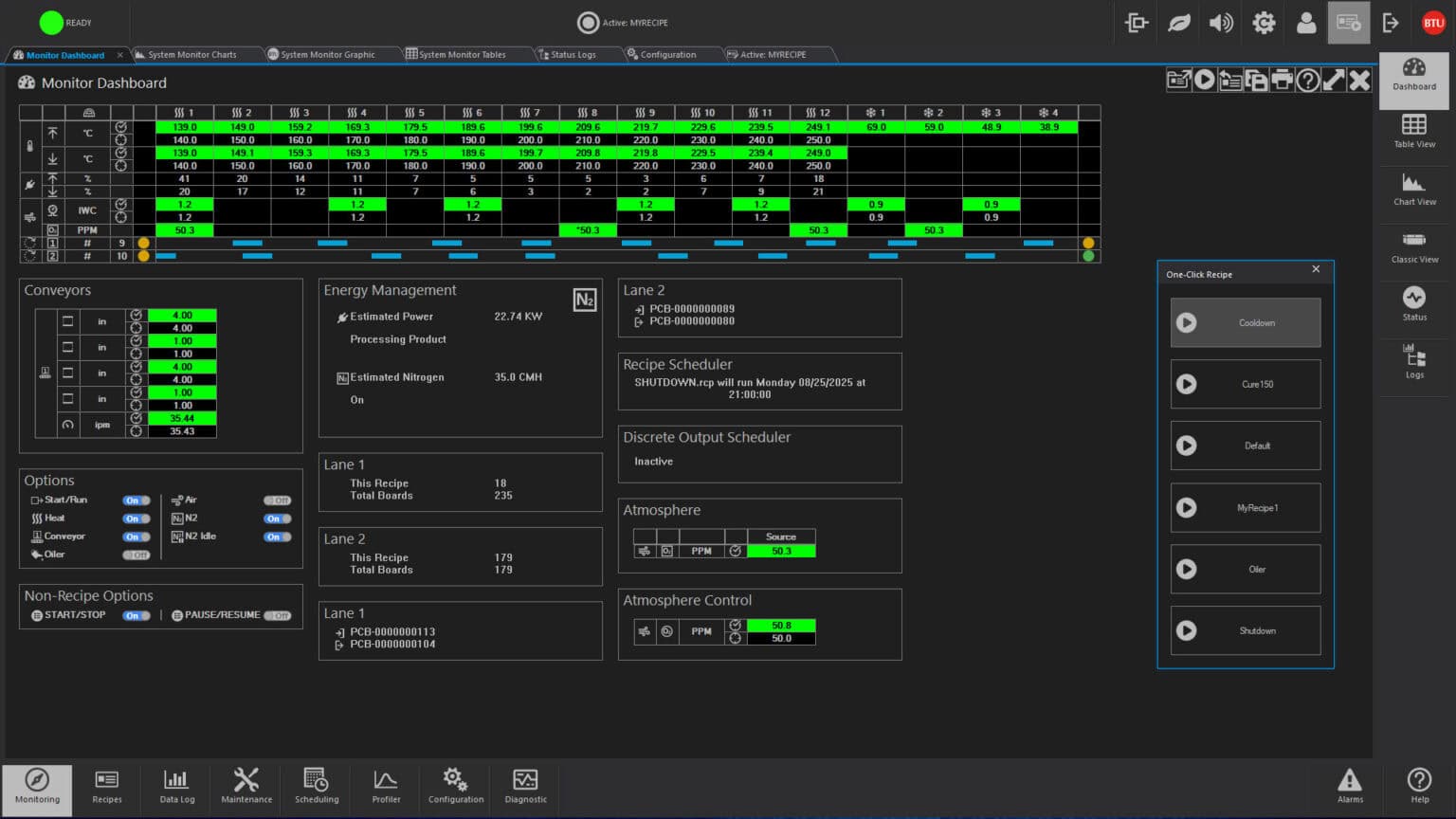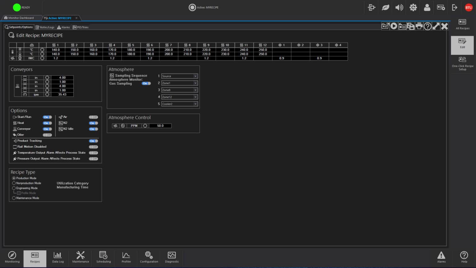Recipes control operation by designating such process parameters as temperature setpoints, temperature trim, alert and alarm deviation limits, belt speeds for single and multiple tracks, PID settings and other optional data. One step recipe editing simplifies changing of data, and automatic recipe scheduling permits two or more recipes to be executed at a given time or after a designated event.