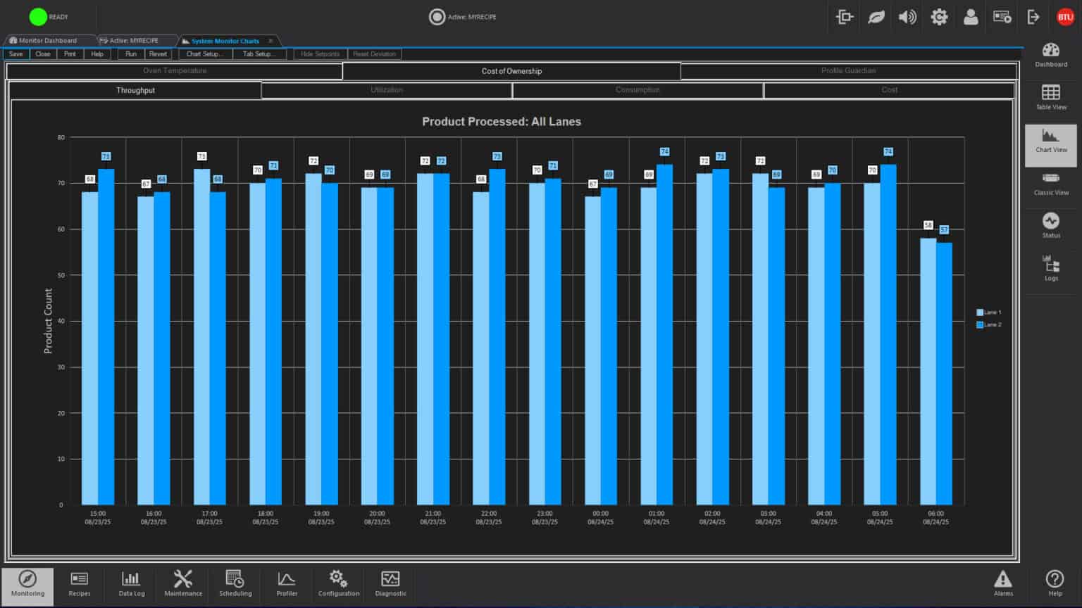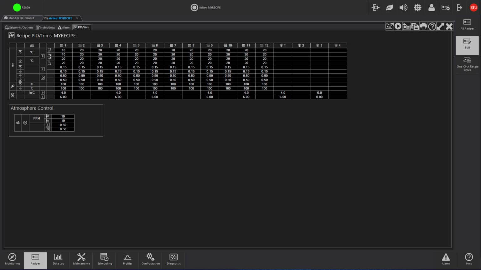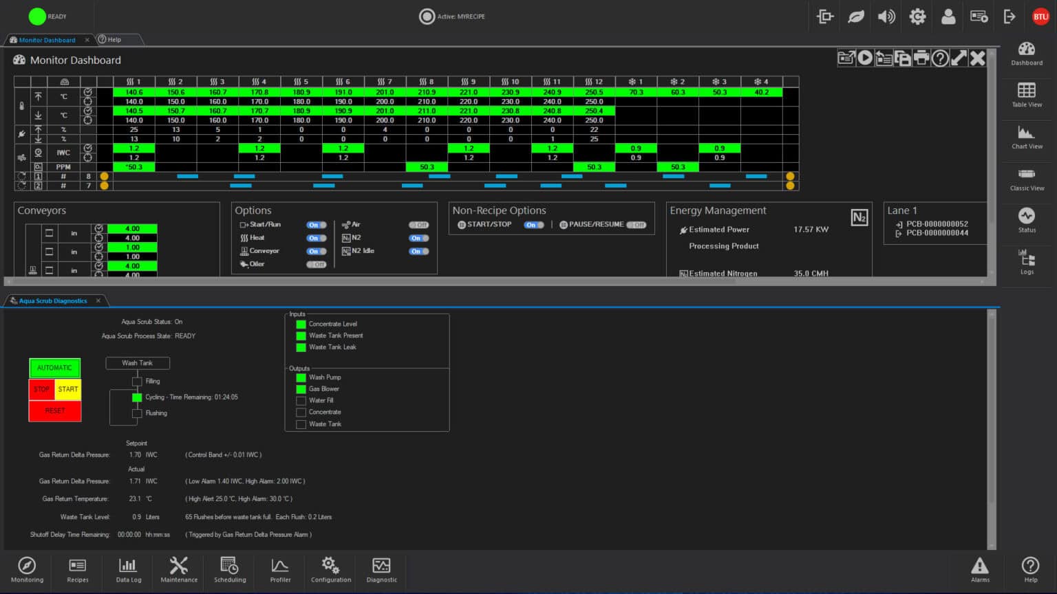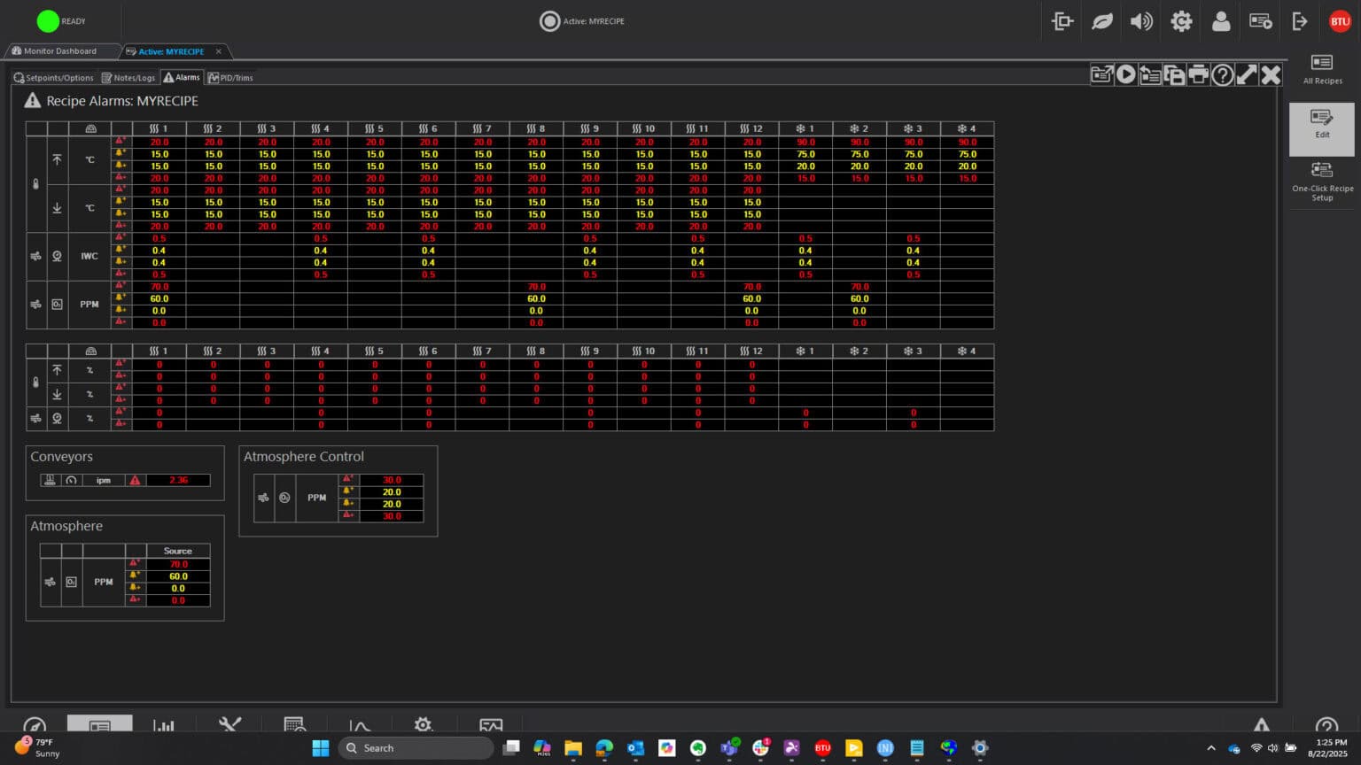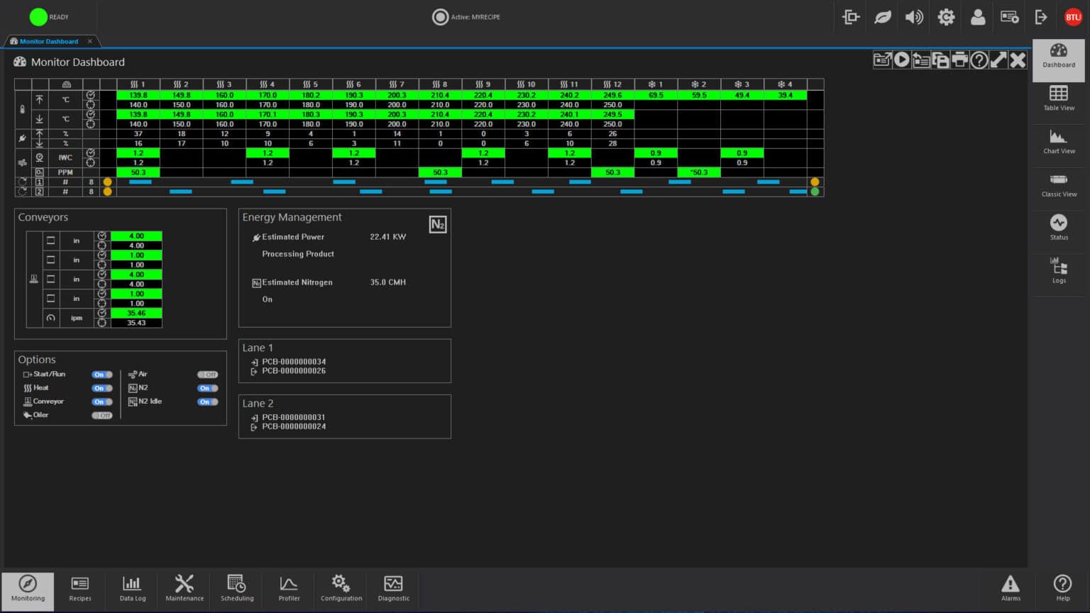 Recipes control operation by designating such process parameters as temperature setpoints, temperature trim, alert and alarm deviation limits, belt speeds for single and multiple tracks, PID settings and other optional data. One step recipe editing simplifies changing of data, and automatic recipe scheduling permits two or more recipes to be executed at a given time or after a designated event.