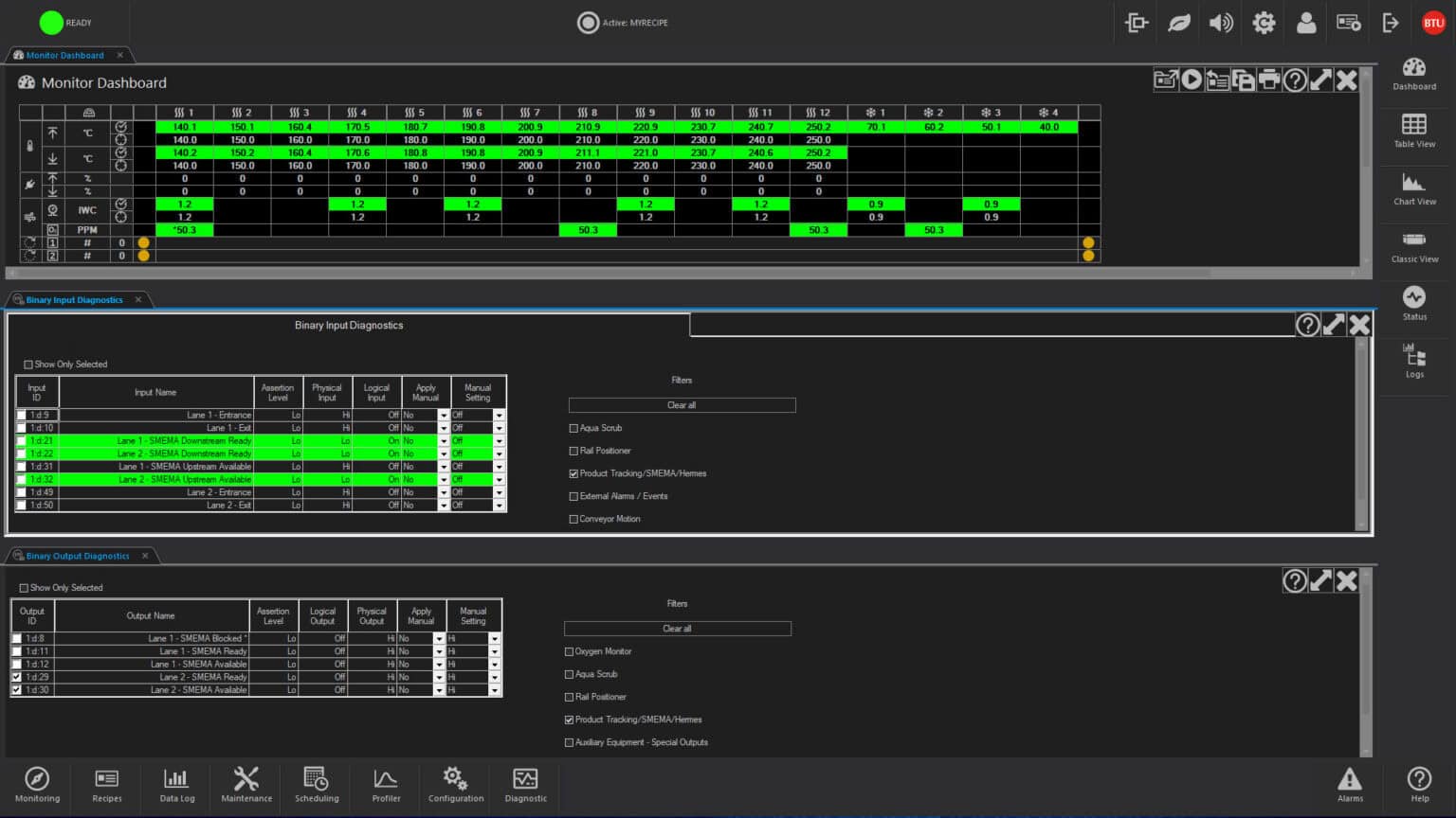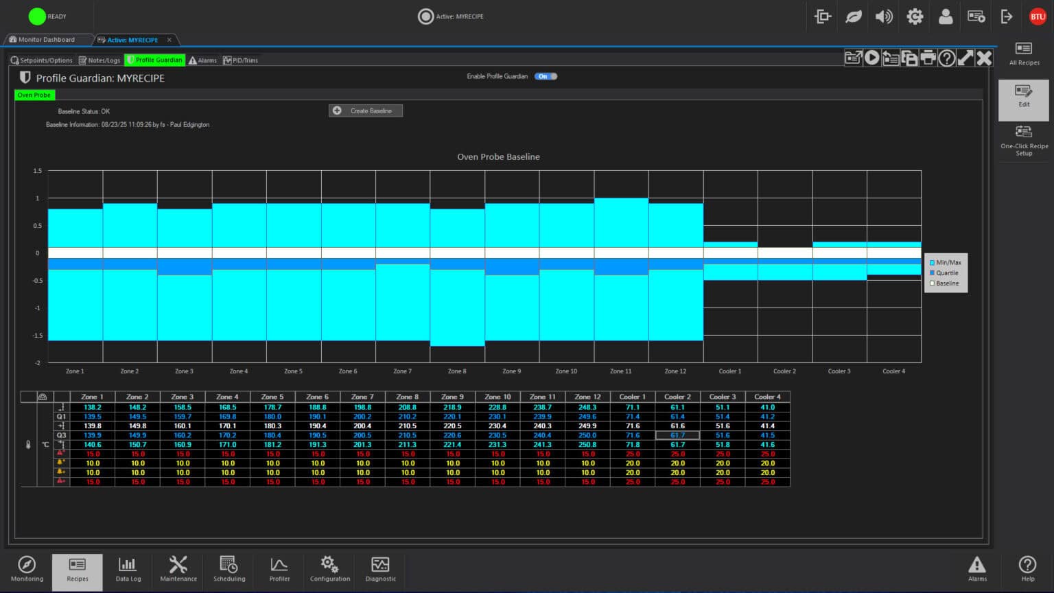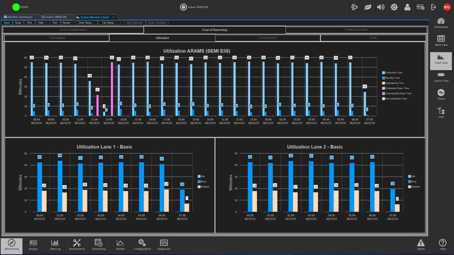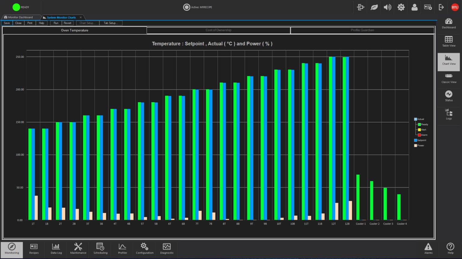 Recipes control operation by designating such process parameters as temperature setpoints, temperature trim, alert and alarm deviation limits, belt speeds for single and multiple tracks, PID settings and other optional data. One step recipe editing simplifies changing of data, and automatic recipe scheduling permits two or more recipes to be executed at a given time or after a designated event.