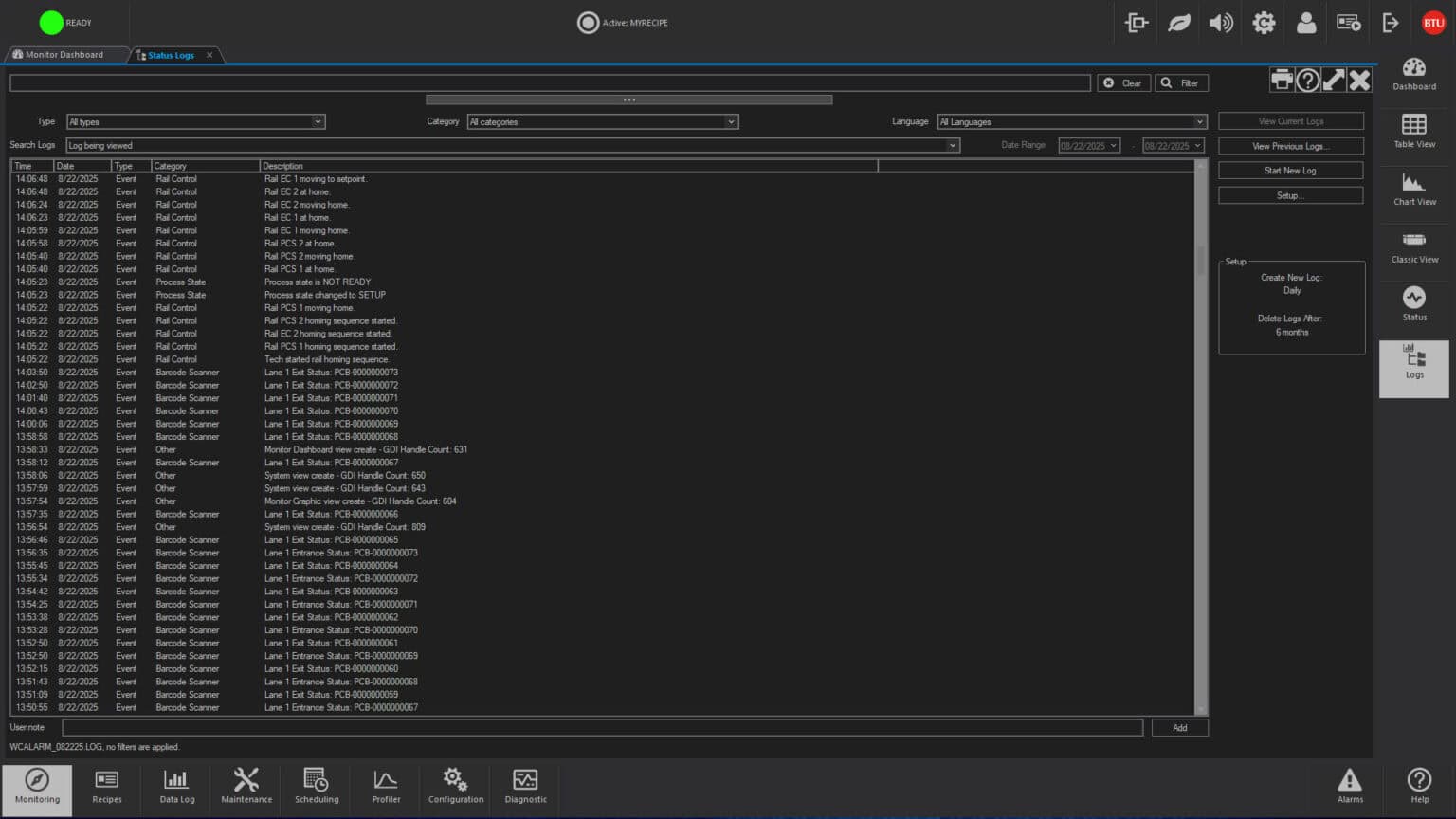 Wincon Barcode supports both handheld and fixed scanners for 1D linear barcodes and 2D Data Matrix barcodes. For automated lines fixed barcode scanners can be used to read the products’ barcode and verify that the correct recipe is running on the equipment. If the recipe is incorrect an alarm will be raised, alternatively if the equipment is empty the correct recipe can be loaded, when the recipe is ready the product will be loaded on to the tool. For manually loaded product a handheld scanner can be used to scan each product barcode before loading to verify the recipe is correct.